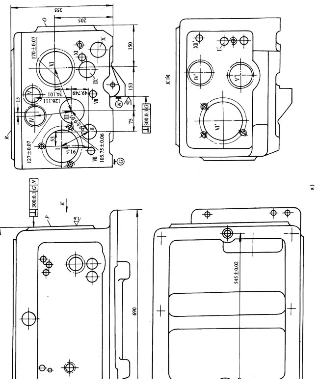 導(dǎo)向支承可以直接固定在夾具體上,夾具剛度好,有利于保證孔系加工的位置精度,且裝卸方便,便于組織生產(chǎn)流水線和實(shí)現(xiàn)情動(dòng)化生產(chǎn),適用于大批大量生產(chǎn)。但這種定位方案也有不足之外,如在加工過程中無法觀察加工情況,無法測(cè)量孔徑和調(diào)整刀具,因而要求采用定尺寸刀具直接保證孔的精度,須相應(yīng)提高頂面R至底面M的尺寸加工精度,同時(shí),兩定位銷孔,圖樣上為主軸孔的沒孔,其精度不高,也提高加工精度。