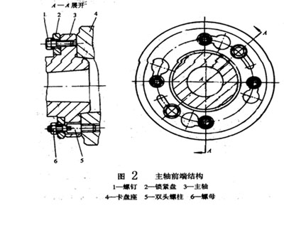 主軸前端采用短錐式結(jié)構(gòu)。安裝時(shí),使事先裝在撥盤或卡盤座4上的四個(gè)雙頭螺母通過主軸肩及鎖緊盤2的圓柱孔,然后將鎖緊盤2轉(zhuǎn)過一個(gè)角度,雙并沒有螺柱5外于鎖緊盤的溝槽內(nèi),并擰緊螺釘1和螺母6,就可以使卡盤或撥盤可靠地安裝在主軸的前端。這種結(jié)構(gòu)裝卸方便,夾緊可靠,定心精度高;不高前端懸伸長度較短,有利于提高主軸組件的剛度,所以得到廣泛的應(yīng)用。主軸軸肩右端面上的圓形撥塊用于傳遞轉(zhuǎn)矩。主軸尾端的圓柱面是安裝各種輔具的安裝基面。