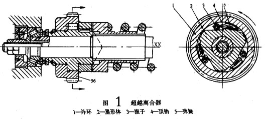 進給過程中,當進給力過大或刀架移動受到阻礙時,為了避免損壞傳動機構(gòu),在溜板箱中設(shè)置有安全離合器M7,使刀架在過載時能自動停止進給,所以亦稱之為進給的過載保護裝置。安全離合器的工作原理見圖1,由光杠傳來的運動經(jīng)單向超離合器的外環(huán)好齒輪Z56,并通過滾子傳給星形體見圖2,再經(jīng)過平鍵傳至M7的左半部1,然后由其螺旋形端面齒傳至離合器的右半部2,再經(jīng)過花鍵傳至ⅩⅩ,離合器的右半部2后端的彈簧3的彈力,克服離合器在傳遞扭矩時所產(chǎn)生的軸向分力,使離合器左、右部分保持嚙合見圖2a