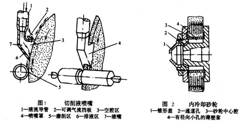 5) 改善切削液供給方式。高速磨削時(shí),磨削溫度極高,面砂輪周圍高速回轉(zhuǎn)形成一股強(qiáng)大的氣流,切削液不易注入磨削區(qū),為避免工件表面燒傷,應(yīng)增加切削液的流量和壓力,并采用特殊噴嘴,如圖1所示,另外還可采用多孔性砂輪,冷卻液不是直執(zhí)著注入磨削區(qū),而是從砂輪內(nèi)部在離心力作用下送入磨削區(qū),如圖2