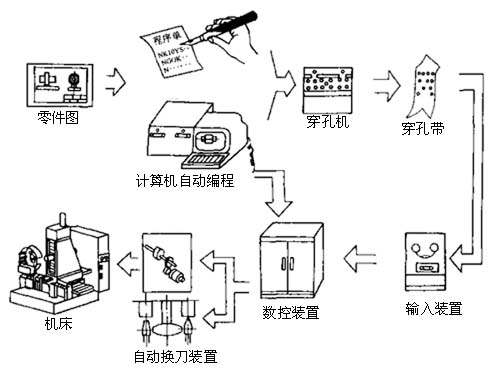 (2) 數(shù)控機床的工作原理。數(shù)控機床和加工中心的工作原理見圖7-2,根據(jù)零件圖樣,制訂工藝方案,編制零件的加工程序,把零件所需的機床各種動作及全部工藝參數(shù)變成機床數(shù)控裝置能接受的信息代碼。并把這些代碼存儲在信息載已上(穿孔帶、磁盤等),將信息載體送到輸入裝置,讀出信息并送入數(shù)控裝置。另一種方法是利用計算機和加工中心的接口直接進行通信輸入。
