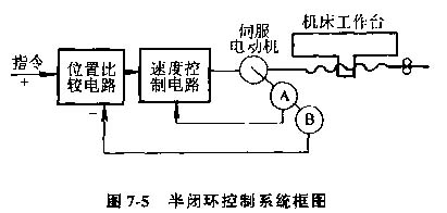 3)半閉環(huán)控制數(shù)控機(jī)床,這種控制方式對(duì)工作臺(tái)的實(shí)際位置不進(jìn)行檢查測量,而是通過與伺服電動(dòng)機(jī)有聯(lián)系的測量元件,如測速發(fā)電機(jī)A和光電編碼盤B(或旋轉(zhuǎn)變壓器)等間接檢測出伺服電動(dòng)機(jī)的轉(zhuǎn)角,推算出工作臺(tái)的實(shí)際位移梁,并與指令值進(jìn)行比較,用差值來實(shí)現(xiàn)控制(圖7-5)。這種控制方式工作臺(tái)沒有完全包括在控制回路內(nèi),精度沒有閉環(huán)高,調(diào)試卻比閉環(huán)方便。