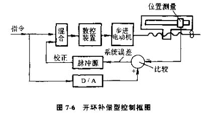 4)開換補(bǔ)償型數(shù)控機(jī)床,將上述三種控制方式的特點(diǎn)有選擇地集中起來,可以組成混合控制的方案。大型數(shù)控機(jī)床,需要高得多的進(jìn)給速度和返回速度,又需要相當(dāng)高的精度。如果只采用全封閉的控制,機(jī)床傳動(dòng)鏈和工作臺(tái)全部置于控制環(huán)節(jié)中,安裝調(diào)試十分復(fù)雜,為了避免這些矛盾,可以采用混合控制方式。圖7-6為開環(huán)補(bǔ)償方式的組成框圖。它的特點(diǎn)是:基本控制選用步進(jìn)電動(dòng)機(jī)的開環(huán)控制伺服機(jī)構(gòu),附加一個(gè)校正伺服電路。通過裝在工作臺(tái)上的直線位移測量元件的反饋信號(hào)來校正機(jī)械系統(tǒng)的誤差