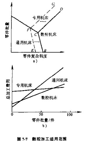 從圖7-7中可看出通用機(jī)床、專用機(jī)床和數(shù)控機(jī)床零件加工批量與生產(chǎn)成本的關(guān)系。在多品種、中小批量生產(chǎn)情況下,采用數(shù)控機(jī)床總費(fèi)用更為合理。