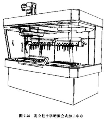 2) 十字珩架型(圖7-26)主軸箱在行車或珩架上作X、Y向運動,主軸滑枕作Z向運動。適用于高度尺寸較小的中小型零件的多工序加工。