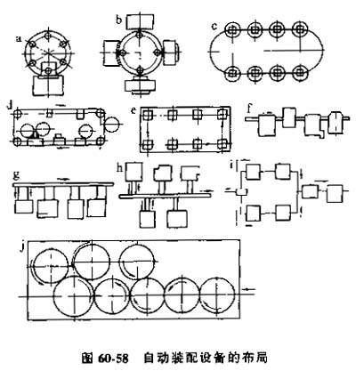圖60-58所示為一些基本的自動(dòng)裝配系統(tǒng)布置,圖中a、b為回轉(zhuǎn)型裝配機(jī),一般用在形狀不復(fù)雜,尺寸不太大、工位數(shù)不多的場合;圖a系統(tǒng)是半自動(dòng)裝配,只有一個(gè)自動(dòng)裝配工位。圖c、d、c系統(tǒng)為產(chǎn)品沿運(yùn)輸裝置運(yùn)動(dòng),在若干個(gè)工序上實(shí)現(xiàn)裝配工序的線性裝配機(jī),圖c所示系統(tǒng)具有水平封閉運(yùn)輸裝置,可用于較復(fù)雜、裝配工位較多的產(chǎn)品裝配,當(dāng)有些裝配工序要求很長的作業(yè)時(shí)間時(shí),宜采用平行一順次裝配,圖f、g、h、i為直線輪換流程式裝配線;圖j為轉(zhuǎn)字式裝配線,在大批量的產(chǎn)品裝配時(shí)優(yōu)先采用。