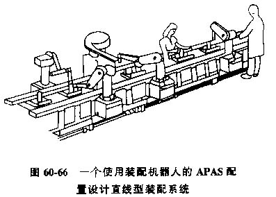 直線型柔性裝配系統(tǒng),圖60-66為一個適用于批量裝配生產(chǎn)的柔性裝配系統(tǒng),稱為可編程序裝配系統(tǒng)。在該系統(tǒng)中,裝配機器人是最重要的設備,不過還需要有傳送零件的輸送帶。機器人沿直線排列。裝配任務是在同一個底座裝配件裝上一個分裝配件,然后由輸送帶送到下一個裝配工位并再裝上另一個分裝配件。如此連續(xù)不斷的依次逐個裝上分裝配件,直至完成全部裝配工作。這種裝配方式最適合使用機器人。要求機器人不僅能完成裝配工作,而且要特殊的技巧或判斷,機器人不能勝任時,則由人工完成作業(yè)。