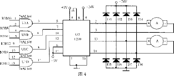 圖4為采用內(nèi)部集成有兩個(gè)橋式電路的專用芯片L298所組成的電機(jī)驅(qū)動電路。驅(qū)動芯片L298是驅(qū)動二相和四相步進(jìn)電機(jī)的專用芯片,我們利用它內(nèi)部的橋式電路來驅(qū)動直流電機(jī),這種方法有一系列的優(yōu)點(diǎn)。每一組PWM波用來控制一個(gè)電機(jī)的速度,而另外兩個(gè)I/O口可以控制電機(jī)的正反轉(zhuǎn),控制比較簡單,電路也很簡單,一個(gè)芯片內(nèi)包含有8個(gè)功率管,這樣簡化了電路的復(fù)雜性,如圖所示IOB10、IOB11控制第一個(gè)電機(jī)的方向,IOB8輸入的PWM控制第一個(gè)電機(jī)的速度;IOB12、IOB13控制第二個(gè)電機(jī)的方向,IOB9輸入的PWM控制第二個(gè)電機(jī)的速度。