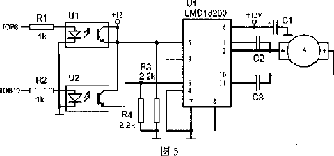 LMD18200是美國國家半導(dǎo)體公司推出的專用于直流電動機(jī)驅(qū)動的H橋組件,同一芯片上集成有CMOS控制電路和DMOS功率器件。此種芯片瞬間驅(qū)動電流可達(dá)6A,正常工作電流可達(dá)3A,具有很強(qiáng)的驅(qū)動能力,無“shot-through”電流,而且此種芯片內(nèi)部還具有過流保護(hù)的測量電路,只需要在 LMD18200的8腳輸出端測出電壓和給定的電壓比較即可保護(hù)電路過流,從而實(shí)現(xiàn)電路的過流保護(hù)功能。由LMD18200組成的電機(jī)驅(qū)動電路如圖5所示。LMD18200的5腳為PWM 波輸入端,通過改變PWM的占空比就可調(diào)節(jié)電機(jī)的速度,改變3腳的高低電平即可控制電機(jī)的正反轉(zhuǎn)。此電路和以上幾種驅(qū)動電路比較具有明顯的優(yōu)點(diǎn),驅(qū)動功率大,穩(wěn)定性好,實(shí)現(xiàn)方便,安全可靠。