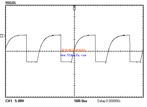 圖4是由示波器產生的PWM頻率為1KHz,占空比80%,電機正轉時的調制波形。
