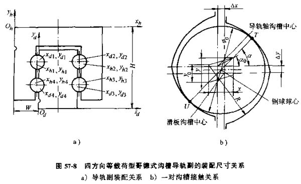 圖57-8a為哥德式直線滾動(dòng)導(dǎo)軌副的裝配關(guān)系,圖57-8b為一對(duì)溝槽的鋼球接觸關(guān)系。該導(dǎo)軌副有四對(duì)溝槽,滑板與導(dǎo)軌軸各對(duì)溝槽的設(shè)計(jì)中心并不在同一點(diǎn),分別位于圖57-8a中的Xhi,Yhi和Xdi,Ydi(i=1,2,3,4),h表示滑板,d表示導(dǎo)軌軸。裝配后鋼球在溝槽中的過(guò)盈量是主要的裝配精度要求之一。