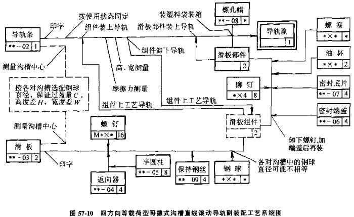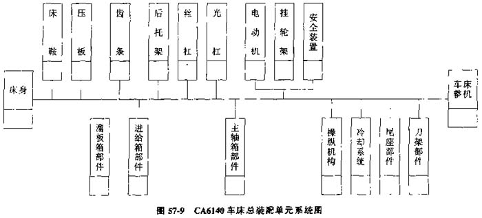 在裝配單元系統(tǒng)圖上,加注必要的工藝說明,如焊接、配鉆、攻螺紋、檢測(cè)及在裝品的移位、翻轉(zhuǎn)等,則夠成裝配工藝系統(tǒng)圖,見圖57-10。