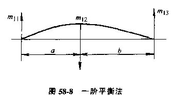 3)進行撓性轉(zhuǎn)子一階振型的高速動平衡,見圖58-8。取平衡轉(zhuǎn)速為第一臨界轉(zhuǎn)速的0.9或1.1倍及三個平衡校正面。在中間的平衡校正面中加上平衡質(zhì)量-m12,兩邊的平衡校正面中分別加上m11、 m13,滿足m12=+ m11= m13和m11×a =m13×b使平衡質(zhì)量的合力和合力矩均零。