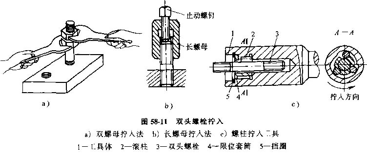 擰緊雙頭螺栓需要給螺栓施加摩擦力,常用的方法為:雙螺母擰緊法(圖58-11a),將兩個(gè)螺母相互鎖緊在螺柱上,轉(zhuǎn)動(dòng)上面的螺母擰緊,長螺母擰緊法(圖58-11b),在雙頭螺栓端部止動(dòng)螺釘使長螺母與雙頭螺栓之間產(chǎn)生拉力,扳動(dòng)長螺母擰動(dòng)螺柱,專用工具法,(圖58-11c),通過工具體的內(nèi)腔曲線和空腔內(nèi)的滾柱體夾緊或松開工件。