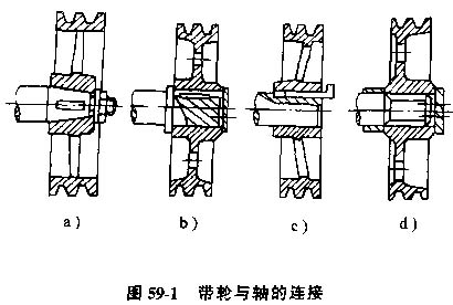 帶輪孔與軸一般采用過(guò)渡配合(H7/K6),有少量過(guò)盈,對(duì)同軸度要求較高。為了傳遞較大的轉(zhuǎn)矩,需用鍵和緊固件進(jìn)行周向,軸向固定,圖59-1所示為帶輪在軸上的集中固定方式。