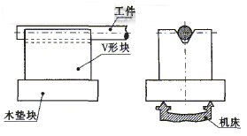粗車時,可采用如圖1所示的支架,支架由V形塊和木墊塊組成,木墊塊壓在機床導(dǎo)軌上。