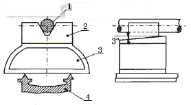 半精車、精車時可采用如圖2所示的托架,托架是在加工過程中起減振作用的主要輔具,托架由兩塊制有3°斜面的木質(zhì)(紅松)托塊組成,上托塊的上面制成V型托口,這可使工件與上托塊在互相作用時能夠形成不完全碰撞,受力時一部分功能將受到損失,以達到減小反作用力的目的。根據(jù)實踐經(jīng)驗,V型夾角α=30°~50°為宜,輔具安放數(shù)量視工件長徑比及工件長度而定,當(dāng)長徑比大于80、工件長大于1500mm以上時,每隔600~800mm放置一個。