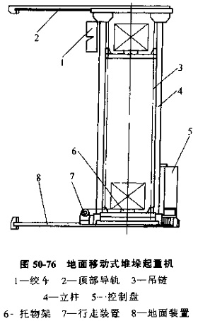 圖50-76所示為地面移動(dòng)堆垛起重機(jī),絞車通過吊鏈帶動(dòng)支持架垂直移動(dòng),托物叉可兩側(cè)滑動(dòng)將托板移動(dòng)進(jìn)或移出,整機(jī)可以在導(dǎo)軌上行走。