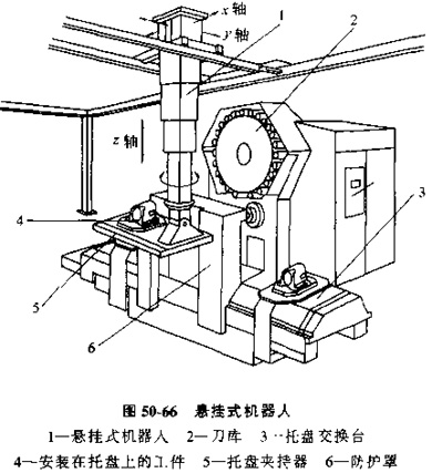 采用空架導(dǎo)軌的懸掛機(jī)器人,也屬于一種變化發(fā)展出的有軌小車(chē),見(jiàn)圖50-66。在廠(chǎng)房?jī)?nèi)安裝了架在空中的導(dǎo)向?qū)к,懸掛式機(jī)器人可以由電動(dòng)機(jī)拖動(dòng)在導(dǎo)軌上行走,工件以及安裝工件托盤(pán),可以由機(jī)器人的支持架托起,并可上下移動(dòng)和旋轉(zhuǎn)。由于機(jī)器人可以自由地在x、y方向上移動(dòng),它就可以將工件連同托盤(pán)移動(dòng)到導(dǎo)軌允許到達(dá)的任意位置上交換托盤(pán)和工件。