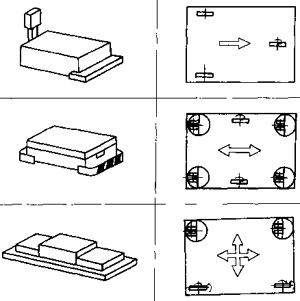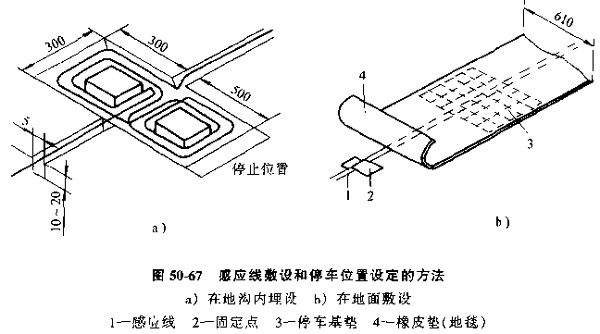 線(xiàn)導(dǎo)小車(chē)的導(dǎo)向方法是靠在地面敷設(shè)電磁感應(yīng)導(dǎo)線(xiàn)來(lái)引導(dǎo)小車(chē),感應(yīng)線(xiàn)的敷設(shè)和停車(chē)位置的設(shè)定方法見(jiàn)圖50-67,過(guò)去因?yàn)楦袘?yīng)線(xiàn)埋沒(méi)在地溝內(nèi),要改變小車(chē)的行駛路線(xiàn)仍然比較困難,現(xiàn)在已可以采用帶狀導(dǎo)線(xiàn)或磁線(xiàn)涂料直接在地面上敷設(shè),所以大大增強(qiáng)了柔性制造系統(tǒng)布局的柔性,這種小車(chē)的緩沖自停精度較差。約為±30mm。若想達(dá)到較高的定位精度。需使用圓錐支點(diǎn)等機(jī)械定位裝置,使其定位精度可達(dá)±0.1mm。