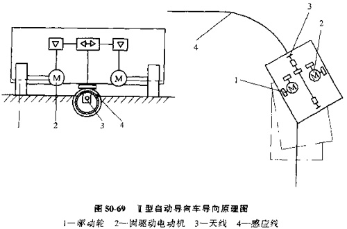 圖50-69所示是Ⅱ型自動(dòng)導(dǎo)向車(chē)的導(dǎo)向原理圖。當(dāng)天線(xiàn)3偏離導(dǎo)向感應(yīng)線(xiàn)4的左右任一側(cè)時(shí)。大線(xiàn)中的一對(duì)線(xiàn)圈的輸入信號(hào)(感應(yīng)電壓)就產(chǎn)生了信號(hào)差,通過(guò)控制系統(tǒng),使左右兩驅(qū)動(dòng)電動(dòng)機(jī)2產(chǎn)生轉(zhuǎn)速差,經(jīng)驅(qū)動(dòng)輪1使小車(chē)沿感應(yīng)線(xiàn)轉(zhuǎn)向,甚至信號(hào)差為零。