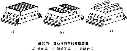 依載裝置。在小車(chē)的臺(tái)面上設(shè)置托盤(pán)或工件的傳送和接收裝置,以實(shí)現(xiàn)與機(jī)床或裝卸站之間的自動(dòng)交換聯(lián)接,圖50-70所示是裝在小車(chē)臺(tái)面上的幾種移載裝置。