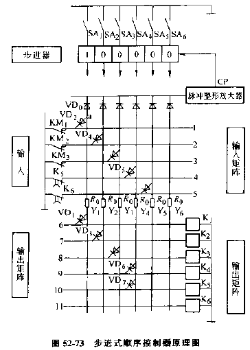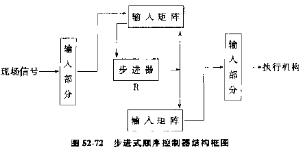 圖52-72是步進式順序控制器的結(jié)構(gòu)框圖。現(xiàn)場信號通過輸入部分加到輸入矩陣,經(jīng)過輸入矩陣的邏輯運算控制步進器步進,步進器R在輸出矩陣邏輯配合下送出信號,完成控制過程。