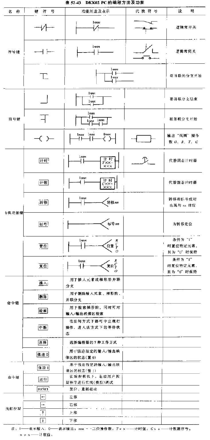 計時器32個,計時范圍(0.1~9.9s),中間記憶256個,順序控制的工程步進器10個,每個32步,外形尺寸485mm×220mm×150mm。該控制器特別適合于老設(shè)備的技術(shù)改造,用DKK02PC代替常規(guī)的繼電器邏輯控制可直接按原來的控制線路進行編程,只是符號做一些變換,DKK02PC的編程方法及功能見表52-43。
