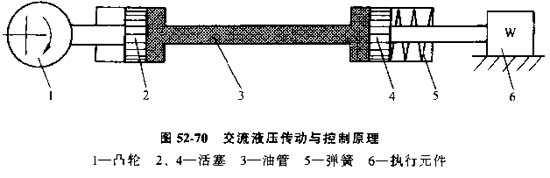 在這種控制系統(tǒng)中,凸輪1推動(dòng)活塞2移動(dòng),活塞2又迫使油管3中的油液流動(dòng),從而推動(dòng)活塞4和執(zhí)行機(jī)構(gòu)6移動(dòng),返回時(shí)靠彈簧5的彈力使整個(gè)系統(tǒng)回原位。執(zhí)行機(jī)構(gòu)的運(yùn)動(dòng)規(guī)律。由凸輪1控制。凸輪1是指令存儲(chǔ)裝置,同時(shí)又是驅(qū)動(dòng)元件,由于在這種系統(tǒng)中,工作油液是在密封的管路中往復(fù)流動(dòng),故稱為交流液壓傳動(dòng)。