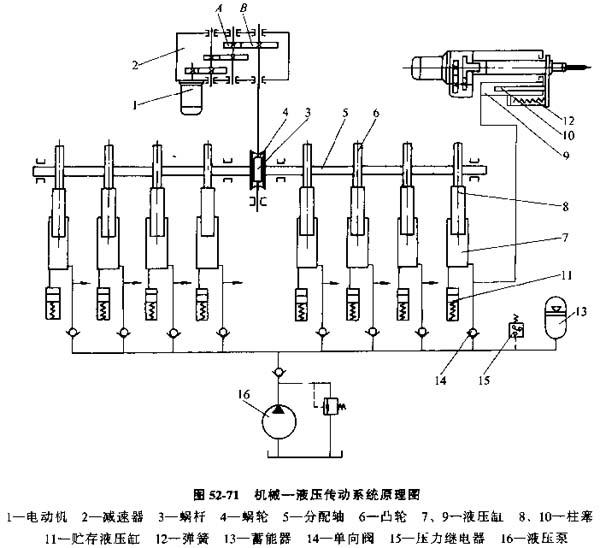 采用交流液壓傳動(dòng)控制的一個(gè)小型自動(dòng)線的工作原理見圖52-71。