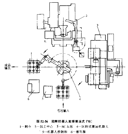 1) 回轉(zhuǎn)機器人直接搬運的FMC(見圖52-56)由1~4臺車削中心或其他數(shù)控機床,以及固定安裝的回轉(zhuǎn)式機器人和工件存貯臺等組成,各設備都布置在機器人周圍或兩側(cè),工件在加工過程中的搬運都由機器人自動實現(xiàn)。