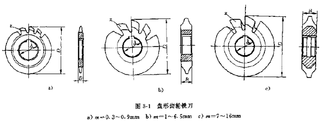 2.盤形齒輪銑刀。GB9063—88標(biāo)準(zhǔn)盤形齒輪銑刀適用于加工基準(zhǔn)齒形角為20°、模數(shù)0.3~16mm的直齒漸開線圓柱齒輪,如圖3-1所示,其采用徑向鏟齒,刀具前角為零度,表3-45給出了盤形齒輪銑刀的基本尺寸。