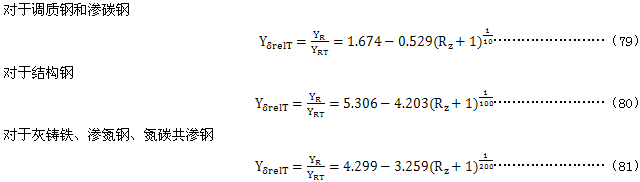 相對齒根表面狀況系數(shù)YδrelT可按粗糙度和材料從圖9查得,圖中曲線是用試件做試驗得到的;也可用式(76)~式(81)計算。