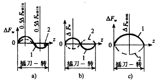 插齒時(shí),有三個(gè)基本因素對(duì)產(chǎn)生△Fw值是有影響的,首先就是機(jī)床分度蝸輪副的運(yùn)動(dòng)誤差(運(yùn)動(dòng)偏心),由于分度蝸輪副運(yùn)動(dòng)偏心所產(chǎn)生的公法線長(zhǎng)度變動(dòng)量是正弦曲線時(shí),每個(gè)分度蝸輪副的誤差相加后得出公法線長(zhǎng)度的總誤差,其值不僅與分度蝸輪副的原始誤差有關(guān),而且與正弦曲線的相位移有關(guān),同時(shí)也與插齒刀與工件齒數(shù)間的比例關(guān)系有關(guān)。如果插齒刀與工件齒數(shù)相等或成整數(shù)倍的話,那么在正弦曲線方向相同的條件下,總誤差Fw將減小(圖1a)。當(dāng)正弦曲線方向不同時(shí),根據(jù)不同的相位距Fw值或可能沒有變化 (圖1b)或達(dá)到最大值(圖1c)。因此可以說,甚至在插削相同工件時(shí),也可能產(chǎn)生不同的原始誤差總值。