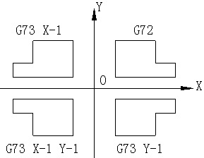 在數(shù)控加工程序代碼中,有個鏡像加工的指令。比如某型號加工中心的鏡像加工指令為G73(示意圖如圖1所示),其中設(shè)原加工圖形為第一象限的G72,使用G73 X-1指令后就可以加工出第二象限所示的圖形。也就是說將原程序段的加工代碼按Y軸或X軸(或XY混合)做軸向鏡像,當要加工鏡像體時不需要另外編制程序,只需要將原程序代碼加以鏡像即可。