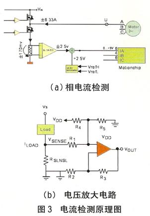 電流檢測(cè) 電機(jī)電流檢測(cè)電路可提供重要的反饋信息,將該信息與來(lái)自主控DSP的控制信號(hào)相結(jié)合,可以控制MOSFET或IGBT的柵極驅(qū)動(dòng)芯片并最終調(diào)整電機(jī)速度。如果要實(shí)現(xiàn)過(guò)流保護(hù),還必需進(jìn)行電流監(jiān)控,不過(guò)對(duì)于低端應(yīng)用而言,傳統(tǒng)的過(guò)流保護(hù)卻顯得過(guò)于昂貴。電流采樣的方案是在逆變橋的下橋臂串一0.027Ω采樣電阻如圖3(a),采樣電流范圍為0~6.22A,采樣后的電壓放大倍數(shù)為14.63倍,放大電路如圖3(b),并經(jīng)2.5V電壓抬升輸入DSP,所以輸入DSP的電流模擬電壓量為: UAD=2.5+I×0.027×14.63。 MotionChip AD口的模擬量輸入電壓為0~5V,所以電流采樣經(jīng)量化的值為: