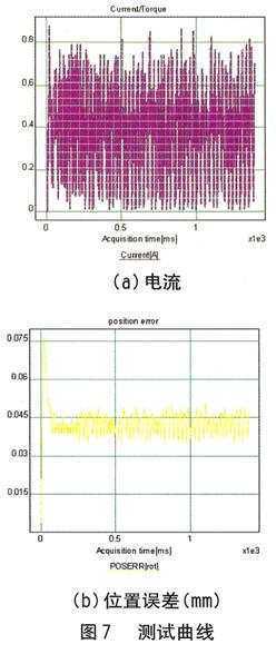 用戶(hù)操作界面功能有: •參數(shù)設(shè)置與顯示模塊主要是設(shè)置一些系統(tǒng)參數(shù)(如掃查長(zhǎng)度,探測(cè)寬度)和控制參數(shù)(如速度參數(shù)、加速度參數(shù)等); •任何時(shí)刻,控制程序都時(shí)刻監(jiān)視系統(tǒng)的運(yùn)行狀況,隨時(shí)對(duì)系統(tǒng)故障做出相應(yīng)的處理。 軟件部分包括X向運(yùn)動(dòng)和Y向的掃查運(yùn)動(dòng),數(shù)據(jù)存儲(chǔ)及處理,手動(dòng)控制,故障處理,運(yùn)動(dòng)狀態(tài)顯示及故障顯示等。操作界面(GUI)給予清晰、簡(jiǎn)單的用戶(hù)界面,方便用戶(hù)調(diào)試、運(yùn)行,同時(shí)能夠?qū)⑺欧?qū)動(dòng)器傳遞過(guò)來(lái)的信息顯示出來(lái),便于監(jiān)控。任務(wù)編程模塊將要實(shí)現(xiàn)控制任務(wù)的規(guī)劃,如X軸向和Y軸向運(yùn)動(dòng)等,包括故障查詢(xún)、處理。 運(yùn)行效果 智能伺服驅(qū)動(dòng)器性能的好壞直接決定整個(gè)系統(tǒng)設(shè)計(jì)的成敗,為此用一直流電機(jī)對(duì)驅(qū)動(dòng)器進(jìn)行測(cè)試,電機(jī)的電流和位置誤差如圖7(a)、(b)所示,從圖7中可以看出,驅(qū)動(dòng)器的響應(yīng)時(shí)間只有0.12s,位置誤差很小。通過(guò)對(duì)通訊速度及上位機(jī)控制命令的測(cè)試顯示,在實(shí)時(shí)性要求不是非常嚴(yán)格的情況下,以RS232串口或者485串口的通訊速率是完全可以滿(mǎn)足系統(tǒng)需求的。