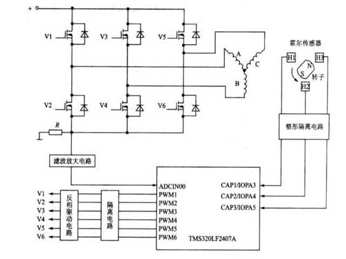 圖2 用TMS320LF2407A實(shí)現(xiàn)三相無刷直流電動(dòng)機(jī)調(diào)速的控制和驅(qū)動(dòng)
