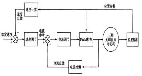 從理論上來看,直流無刷電動(dòng)機(jī)的速度和轉(zhuǎn)矩控制主要依據(jù)如下的轉(zhuǎn)矩和反電動(dòng)勢工程計(jì)算方程 其中,N為直流無刷電動(dòng)機(jī)定子每相線圈數(shù), 為轉(zhuǎn)子的長度,r為轉(zhuǎn)子的內(nèi)徑,B為轉(zhuǎn)子的磁通密度, 為電動(dòng)機(jī)的角速度,i為相電流,L為相感抗, 為轉(zhuǎn)子的位置,R為相阻抗[5]。 從方程可以看到,反電動(dòng)勢與電動(dòng)機(jī)的轉(zhuǎn)速成比例,而轉(zhuǎn)矩與相電流也幾乎勢成比例的。根據(jù)這些特點(diǎn),在方案中采用了圖3所示的控制策略。給定轉(zhuǎn)速與速度反饋形成偏差,經(jīng)速度調(diào)節(jié)后產(chǎn)生電流參考量,它與電流反饋量的偏差經(jīng)電流調(diào)節(jié)后形成PWM占空比的控制量,實(shí)現(xiàn)電動(dòng)機(jī)的速度控制。電流的反饋是通過檢測電阻上的壓降來實(shí)現(xiàn)的。速度反饋是通過霍爾傳感器輸出的位置量,經(jīng)過計(jì)算得到的。位置傳感器輸出的位置量還用于控制換相。