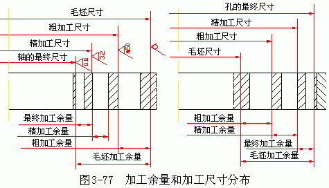 加工總余量也是個變動值,其值及公差一般可從有關(guān)手冊中查得或憑經(jīng)驗確定。如圖 3-77 表示了內(nèi)孔和外圓表面經(jīng)多次加工時,加工總余量、工序余量與加工尺寸的分布圖。