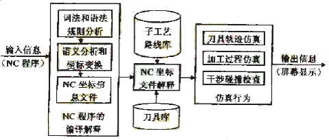 本文設(shè)計的數(shù)控車削仿真系統(tǒng)既可以對手工編制的單機數(shù)控車削程序進行仿真,也可以作為CAD/CAPP/CAM集成制造系統(tǒng)中的一個子系統(tǒng),對集成制造系統(tǒng)自動產(chǎn)生的數(shù)控車削程序進行仿真。該系統(tǒng)可以完成對子程序的處理,允許運動坐標的續(xù)效代碼和注釋行的存在,并且支持多種數(shù)控代碼格式,是一個通用的數(shù)控車削NC 程序仿真系統(tǒng),其工作流程如圖1所示。