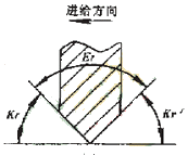 具體的干涉碰撞檢查算法,是在插值點將加工刀具的主偏角和副偏角與直線傾斜角度比較,對于圓弧段輪廓,則與該插值點在圓弧輪廓的切線的傾斜角進行比較,并區(qū)分順圓和逆圓兩種情況。以右車刀切外輪廓為例,其對于直線和圓弧的干涉檢查如圖4所示。檢查結(jié)果將寫入一個干涉報告中,圖4中,kr為主偏角.kr'為副偏角,Er為刀尖角,A為與切削加工方向相反的傾斜角,B為與切削加工方向相同的傾斜角。當A>kr時,刀具副切削刃和零件表面發(fā)生干涉,當180°+B<180°-kr時,刀具的主切削刃和零件表面發(fā)生干涉,這時將發(fā)生過切現(xiàn)象二對于不同的加工方向和加工輪廓,上述判別式應進行相應的調(diào)整。