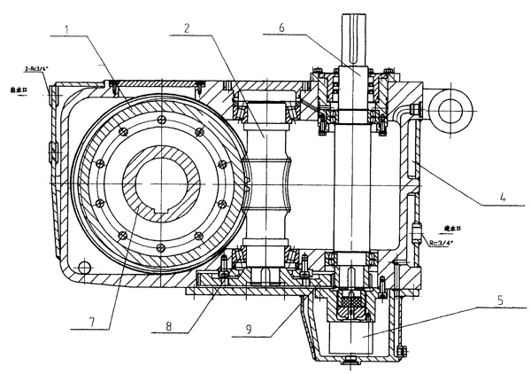 | 一種拉矯機蝸輪減速機,蝸輪采用高強耐磨材料,空心輸出軸的兩端裝有骨架橡膠密封圈,潤滑油泵為雙向油泵。該蝸輪減速箱為兩級減速傳動,動力由立式電機輸入,經(jīng)輸入軸下面的斜齒輪、將動力傳給蝸桿,蝸桿與蝸輪嚙合,由空心輸出軸將動力傳給拉坯輥。雙向潤滑油泵在輸入軸的下端,為蝸輪箱上面的兩個軸承提供壓力潤滑。蝸輪箱的六面為夾層水套,為系統(tǒng)提供冷卻。軸承分別裝在三根軸的兩端,固定在箱體上?招妮敵鲚S的兩端骨架密封圈由端蓋和水隔絕熱流,確保密封圈溫度始終處于水溫狀態(tài)下。 |