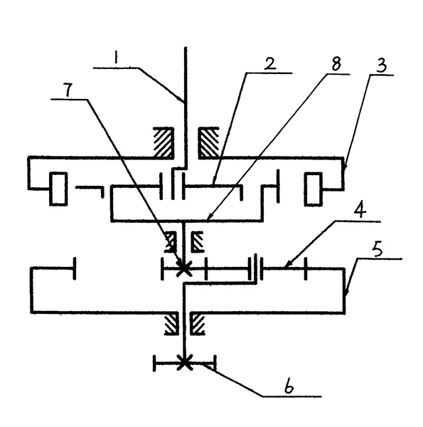 本實用新型公開了一種可應用于塔式起重機回轉機構中的回轉減速機,主要由擺線針輪部分和行星齒輪部分組成,其特點是:將擺線針輪的輸出機構與行星齒輪部分中的輸入太陽輪固定連接,使擺線針輪的輸出部分和行星齒輪的輸入部分連接為一體。其優(yōu)點是:1.與擺線針輪減速機相比,解決了低速級易損壞的問題;2.與行星齒輪減速機相比,解決了偏心矩A的問題,即:輸入軸與輸出軸處于同一中心線上,兩者之間無中心偏移量,便于在輸入軸上使用皮帶輪;3.與行星齒輪減速機相比明顯增大了減速比,二級減速時減速比最大可達652.5,而且減少了傳動級數(shù)。