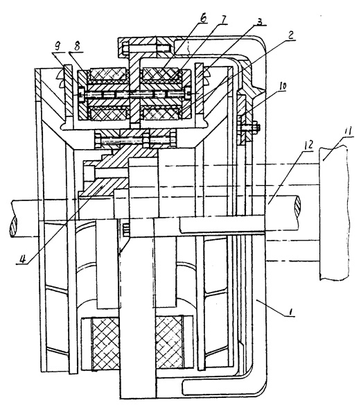 | 一種電渦流減速機(jī),由支架(1)、線圈固定盤(2)、葉輪(3)、軸套(4)和電氣控制箱(5)組成,其特征在于: a、線圈固定盤(2)包括線圈(6)和固定盤(7),線圈(6)固定于固定盤(7)的芯軸內(nèi),扇形板(8)、支架蓋(9)依次緊壓于固定盤(7); b、固定盤(7)通過(guò)法蘭盤(10)與支架(1)聯(lián)接為一體安裝于變速箱(11)上; c、軸套(4)裝于變速箱(11)的傳動(dòng)軸(12)上,一對(duì)葉輪(3)分別裝于軸套(4)兩邊上; d、線圈(6)由旋鈕開關(guān)(13)與電氣控制箱(5)聯(lián)接。 |