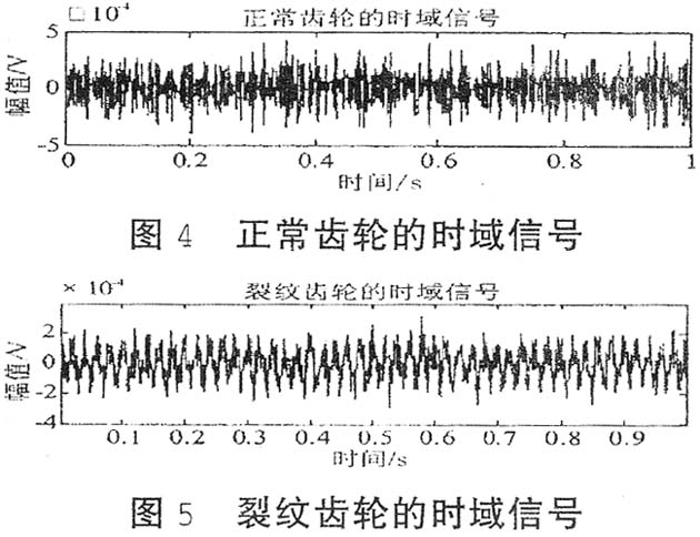 有限元仿真的正常齒輪的第10階固有頻率為708.17Hz,由采樣定理,取采樣頻率為2048Hz就可以了,采樣點數(shù)取為2048,輸入軸齒輪齒數(shù)z1=20,輸出軸齒輪齒數(shù)z2=30,輸入軸的回轉(zhuǎn)頻率為ƒr1=18.55Hz,因此嚙合頻率ƒm=371Hz。圖4和圖5分別給出了正常齒輪和裂紋齒輪(裂紋深度為4mm)的振動信號時域波形圖。