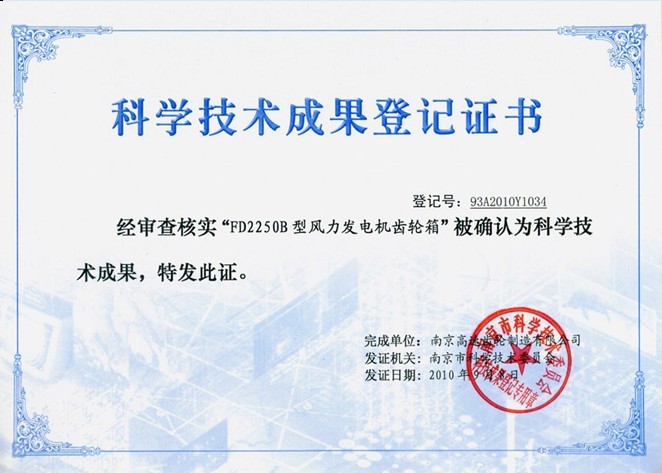2010年8月26日,在南京高速齒輪制造有限公司(以下簡稱:高速公司)400畝廠區(qū),召開了“ FD1775B、FD2250B型風力發(fā)電機齒輪箱”科技成果鑒定會。會議邀請了南京理工大學、南京航空航天大學、東南大學、南京市江寧區(qū)科技局等單位的專家、領導組成了鑒定委員會。鑒定委員會聽取了高速公司的項目研制工作總結等報告,審查了相關技術文件,考察了生產(chǎn)現(xiàn)場。最終一致認為高速公司研制的兩項產(chǎn)品總體技術水平達到了國際同類產(chǎn)品先進水平,同意通過科技成果鑒定,并希望進一步擴大國內(nèi)外市場。