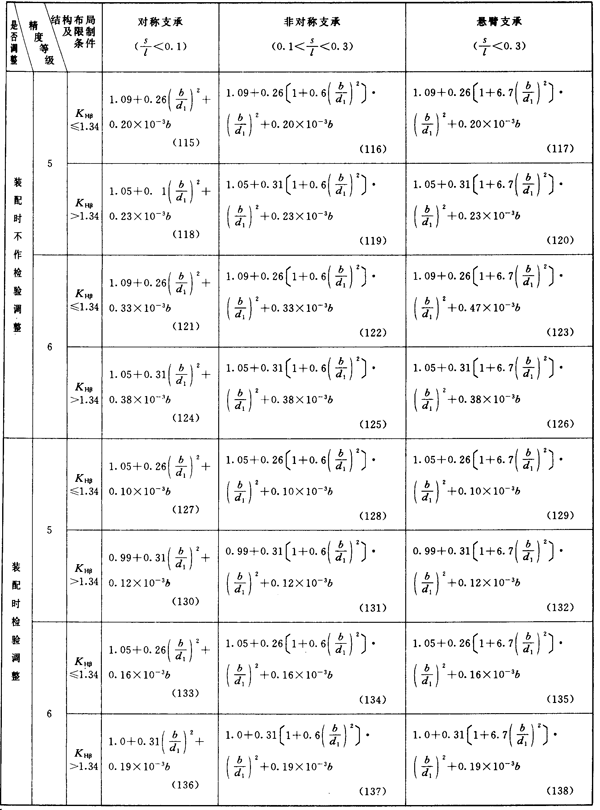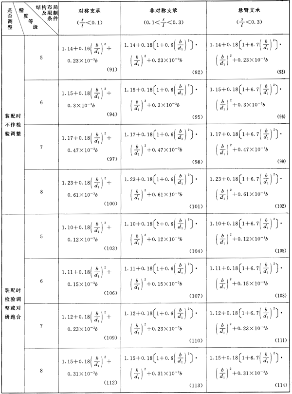 齒輪第Ⅲ公差組精度為5~8級(硬齒面為5~6級)及相應(yīng)的結(jié)構(gòu)布局限制條件的KHβ簡化計(jì)算公式見表14或表15。