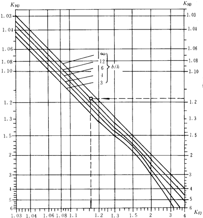 齒向載荷分布系數(shù)KFβ是考慮沿齒寬載荷分布對齒根彎曲應(yīng)力的影響。對于所有的實(shí)際應(yīng)用范圍,KFβ可按下式計(jì)算: