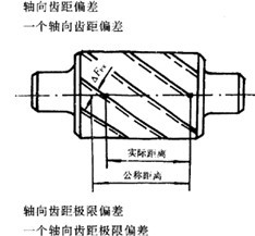 在有效齒寬范圍內(nèi),與齒輪基準軸線平行面大約通過凸齒或凹齒中部的一條直線上,任一軸向齒距內(nèi),兩個同側(cè)齒面間的實際距離與公稱距離之差。沿齒面法線方向計值。 |